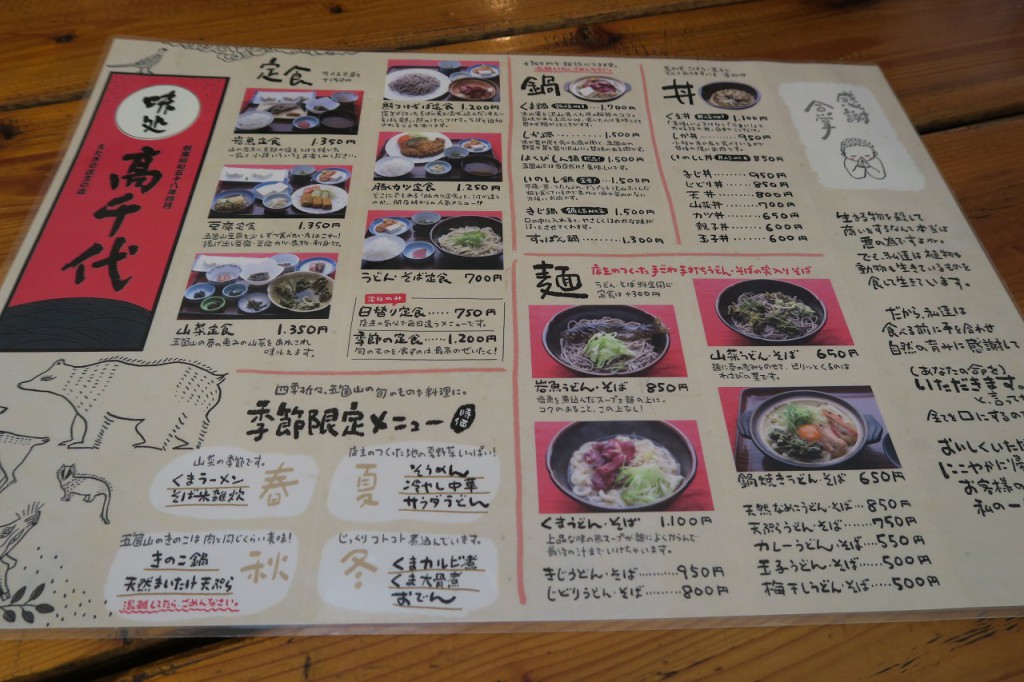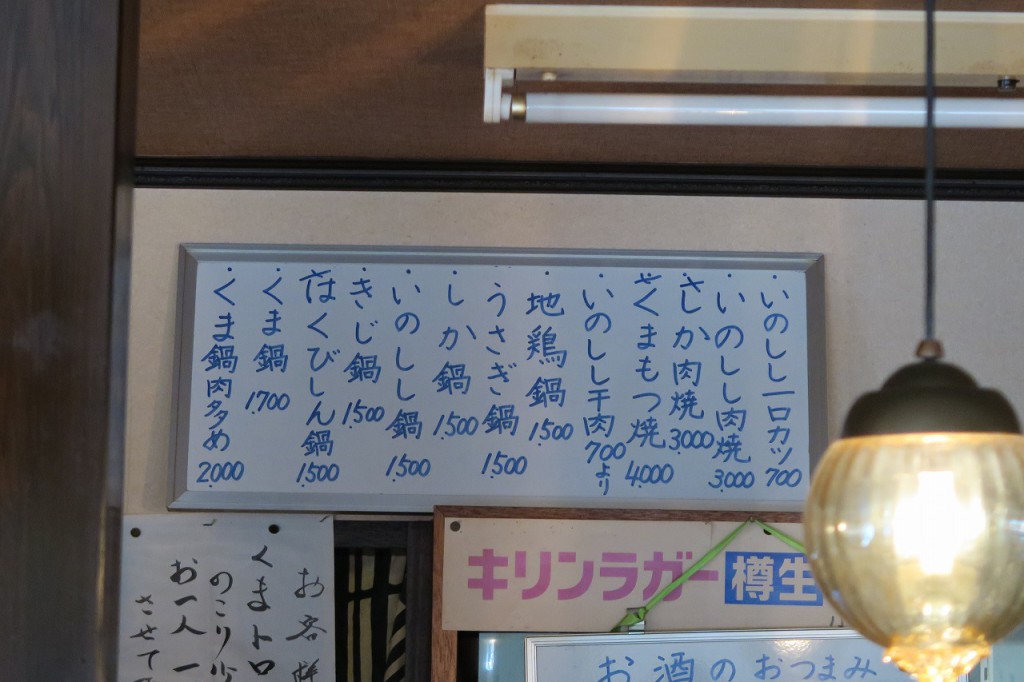 メニューには、イノシシ、きじの文字が。これがジビエ料理かと思って良く見ると、ハクビシン鍋、うさぎ鍋の文字が!これはちょっと勇気がいります。