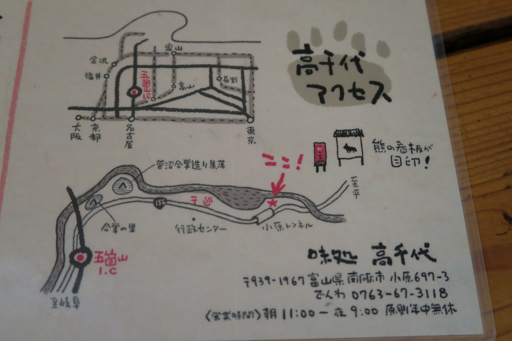 世界遺産で有名な合掌つくりの里、「五箇山 菅沼合掌集落」より3.5km 車で約10分のところにあります。熊の看板と緑提灯が目印です。